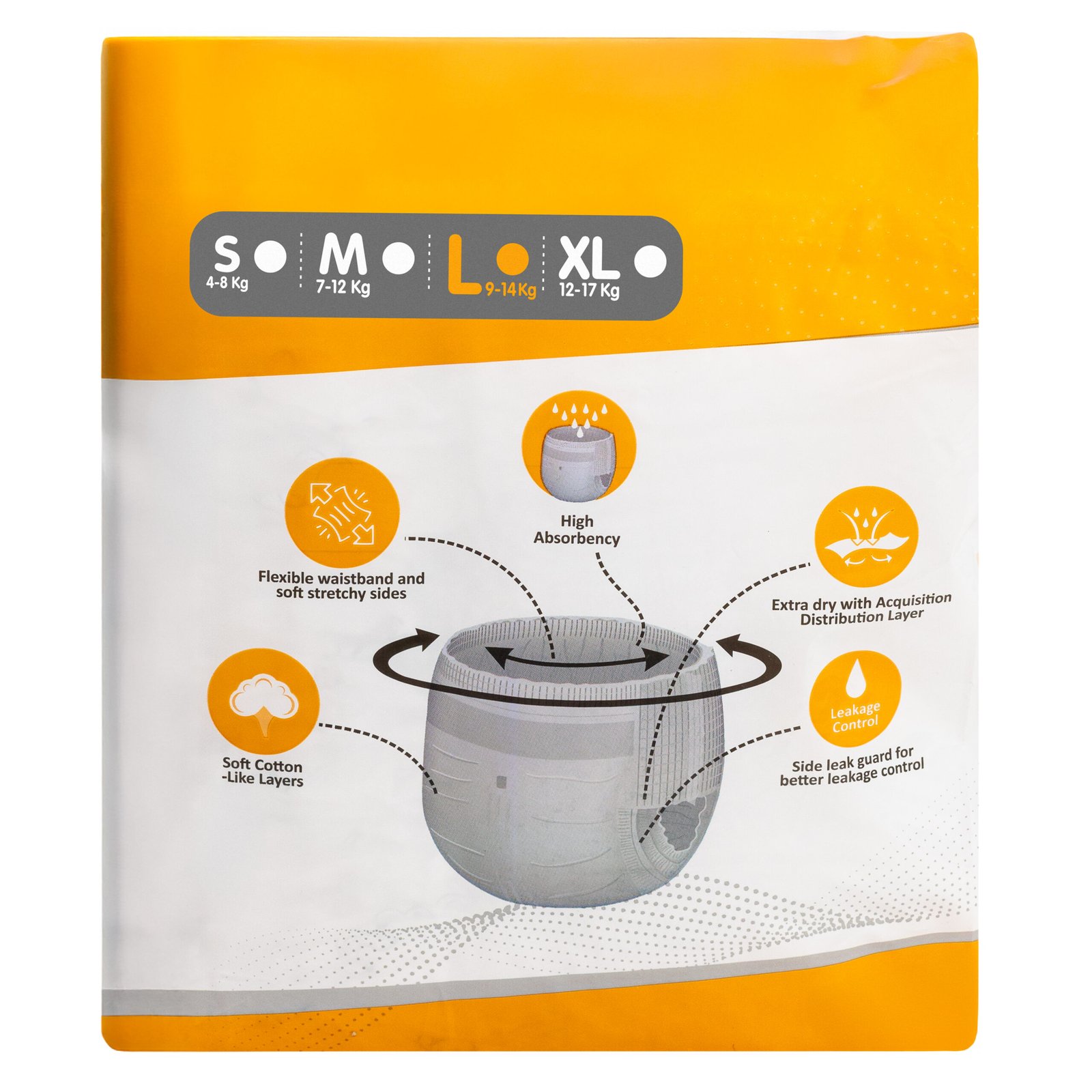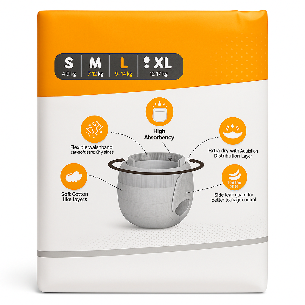 Let your baby enjoy every moment in comfort and happiness with Bumpi Care Premium Baby Pants (L Size) – specially crafted to provide super-soft comfort, all-night leak protection, and antibacterial care for your baby’s delicate skin. These premium baby pants are designed using ultra-absorbent technology that locks in wetness instantly and keeps your baby dry for long hours. Perfect for both daytime play and peaceful nights with wet indicator yellow to blue line Bumpi Care ensures your little one always feels fresh and protected. The 100% leak-proof protection layer prevents leakage even during long naps, while the antibacterial sheet guards against rashes, irritation, and infections. With extra cushioning and a breathable, cotton-like feel, these baby pants provide gentle care and ultimate comfort for your baby’s sensitive skin. The 360 stretchable waistband ensures a snug yet flexible fit that adapts to every movement without leaving red marks. Bumpi Care Baby Pants are easy to wear and remove – just pull them up like underwear and tear the sides to remove when soiled. Each diaper is lightweight, hygienic, and carefully packed to maintain purity and quality. Available Size:-S, M, L & XL.