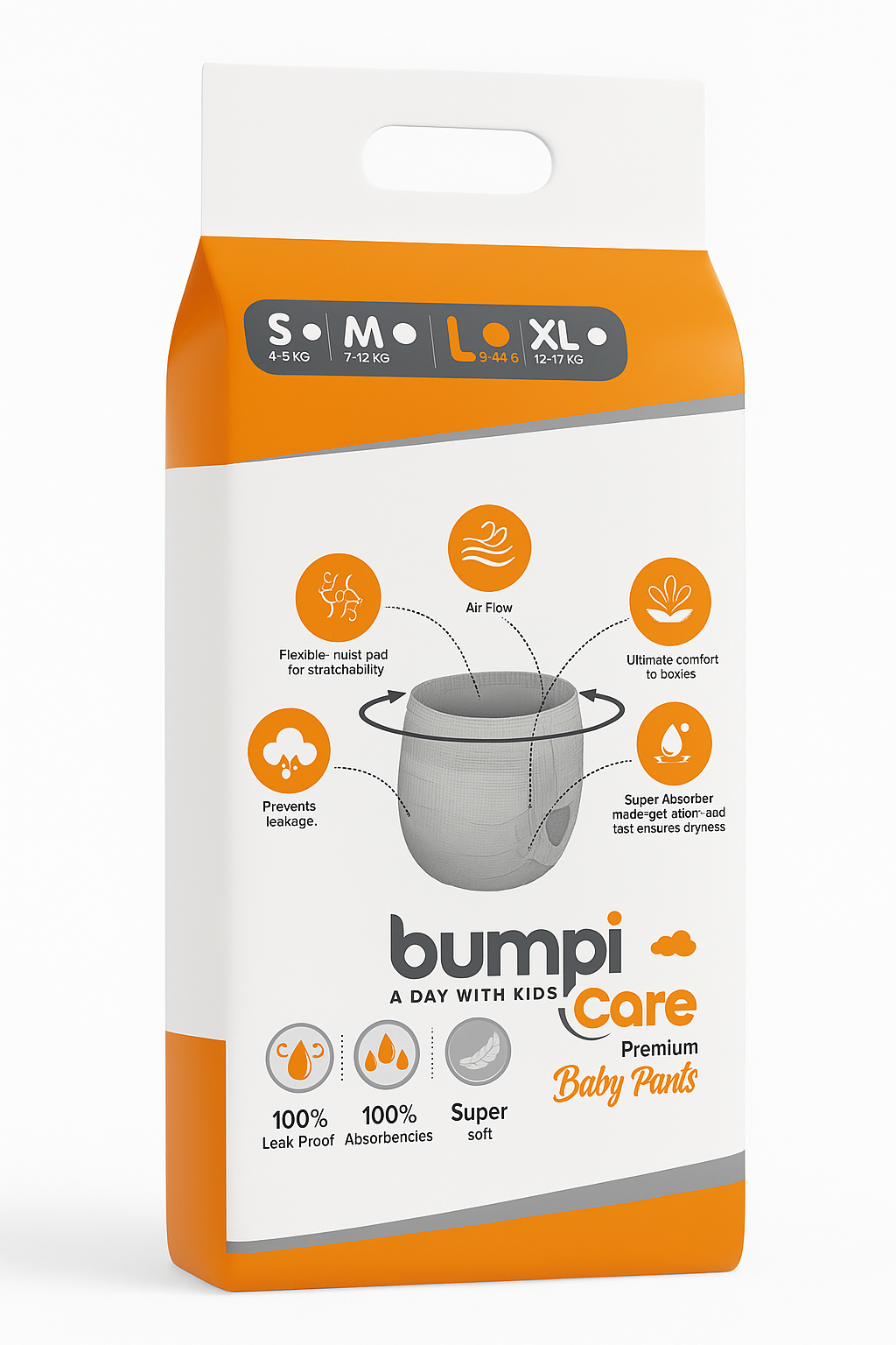 Let your baby enjoy every moment in comfort and happiness with Bumpi Care Premium Baby Pants (L Size) – specially crafted to provide super-soft comfort, all-night leak protection, and antibacterial care for your baby’s delicate skin. These premium baby pants are designed using ultra-absorbent technology that locks in wetness instantly and keeps your baby dry for long hours. Perfect for both daytime play and peaceful nights with wet indicator yellow to blue line Bumpi Care ensures your little one always feels fresh and protected. The 100% leak-proof protection layer prevents leakage even during long naps, while the antibacterial sheet guards against rashes, irritation, and infections. With extra cushioning and a breathable, cotton-like feel, these baby pants provide gentle care and ultimate comfort for your baby’s sensitive skin. The 360 stretchable waistband ensures a snug yet flexible fit that adapts to every movement without leaving red marks. Bumpi Care Baby Pants are easy to wear and remove – just pull them up like underwear and tear the sides to remove when soiled. Each diaper is lightweight, hygienic, and carefully packed to maintain purity and quality. Available Size:-S, M, L & XL.