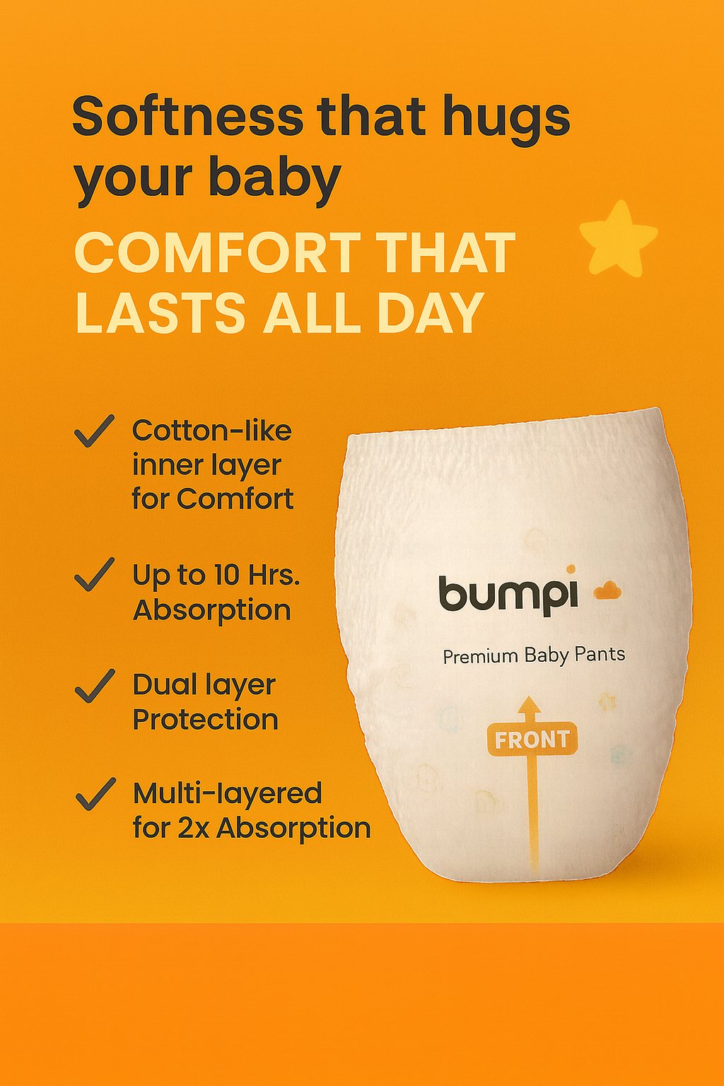 Let your baby enjoy every moment in comfort and happiness with Bumpi Care Premium Baby Pants (M Size, 50 Pants) — specially crafted to provide super-soft comfort, all-night leak protection, and antibacterial care for your baby’s delicate skin.