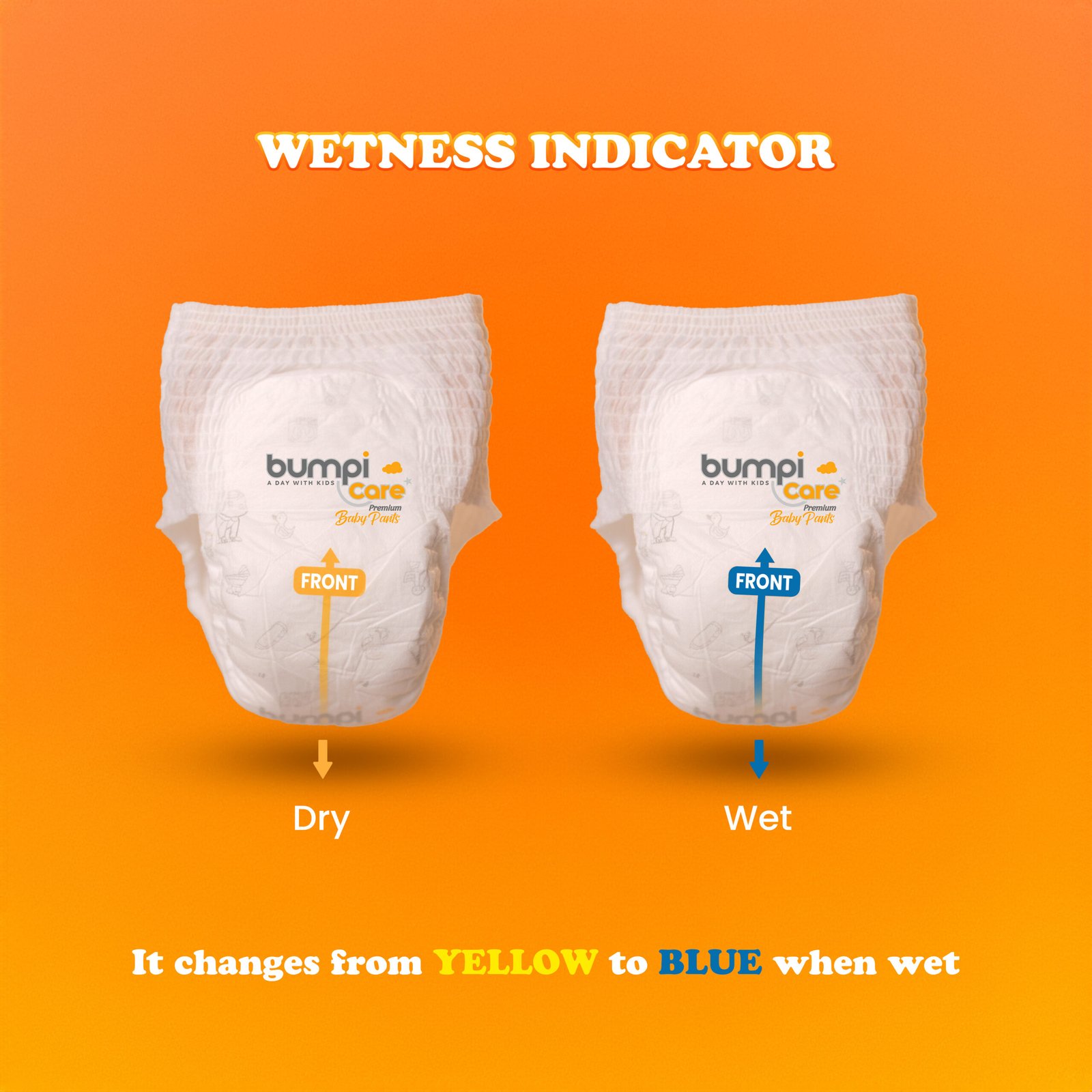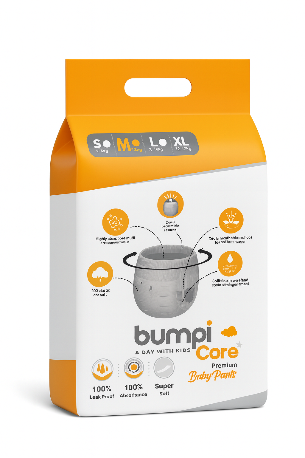 Let your baby enjoy every moment in comfort and happiness with Bumpi Care Premium Baby Pants (M Size, 50 Pants) — specially crafted to provide super-soft comfort, all-night leak protection, and antibacterial care for your baby’s delicate skin. These premium baby pants are designed using ultra-absorbent technology that locks in wetness instantly and keeps your baby dry for long hours. Perfect for both daytime play and peaceful nights with wet indicator yellow to blue line Bumpi Care ensures your little one always feels fresh and protected. The 100% leak-proof protection layer prevents leakage even during long naps, while the antibacterial sheet guards against rashes, irritation, and infections. With extra cushioning and a breathable, cotton-like feel, these baby pants provide gentle care and ultimate comfort for your baby’s sensitive skin. The 360° stretchable waistband ensures a snug yet flexible fit that adapts to every movement without leaving red marks. Bumpi Care Baby Pants are easy to wear and remove — just pull them up like underwear and tear the sides to remove when soiled. Each diaper is lightweight, hygienic, and carefully packed to maintain purity and quality.