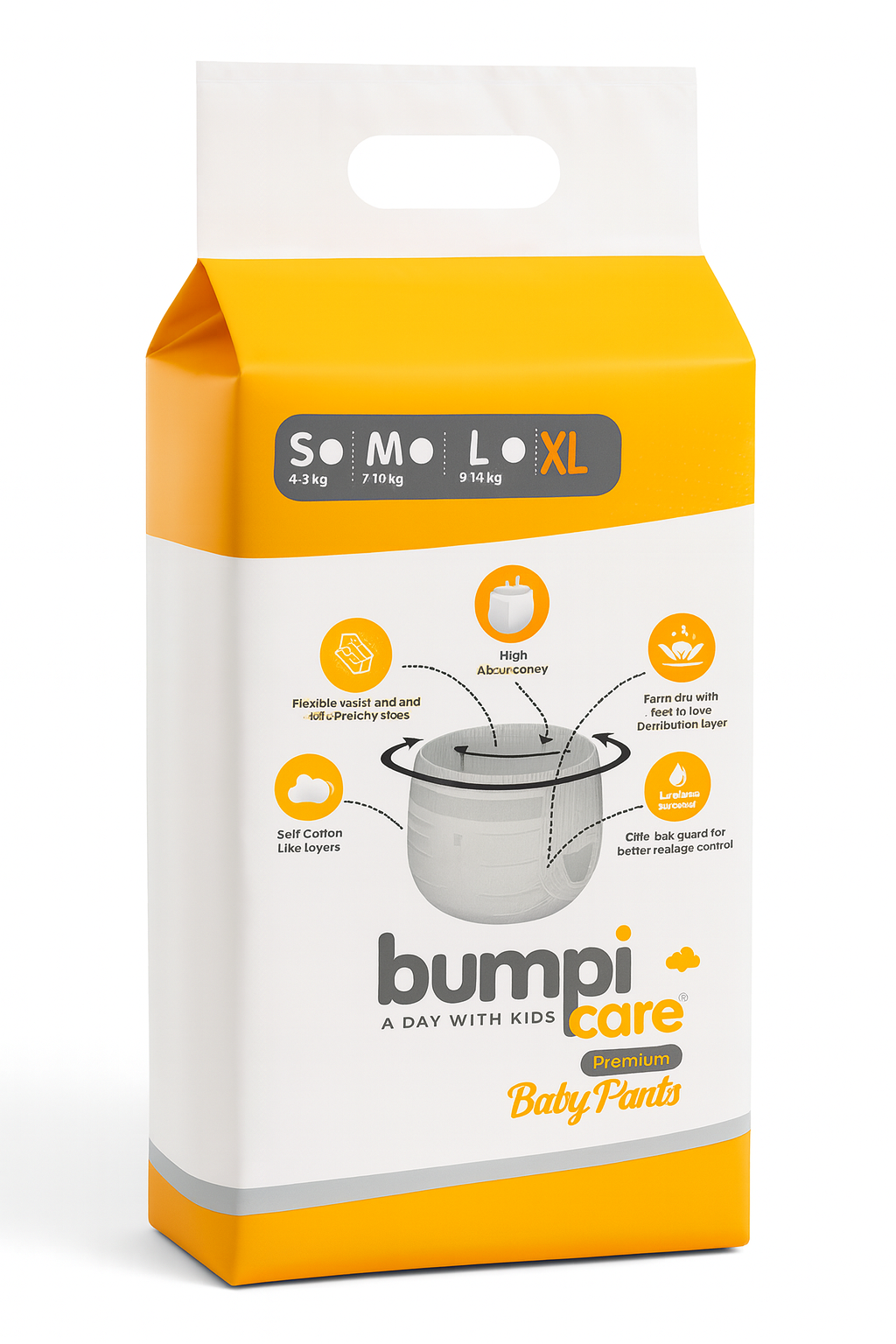 Let your baby enjoy every moment in comfort and happiness with BumpiCare Premium Baby Pants (XL Size) – specially crafted to provide super-soft comfort, all-night leak protection, and antibacterial care for your baby’s delicate skin. These premium baby pants are designed using ultra-absorbent technology that locks in wetness instantly and keeps your baby dry for long hours. Perfect for both daytime play and peaceful nights with wet indicator yellow to blue line BumpiCare ensures your little one always feels fresh and protected. The 100% leak-proof protection layer prevents leakage even during long naps, while the antibacterial sheet guards against rashes, irritation, and infections. With extra cushioning and a breathable, cotton-like feel, these baby pants provide gentle care and ultimate comfort for your baby’s sensitive skin. The 360 stretchable waistband ensures a snug yet flexible fit that adapts to every movement without leaving red marks. BumpiCare Baby Pants are easy to wear and remove – just pull them up like underwear and tear the sides to remove when soiled. Each diaper is lightweight, hygienic, and carefully packed to maintain purity and quality. Available Size:-S, M, L & XL.
